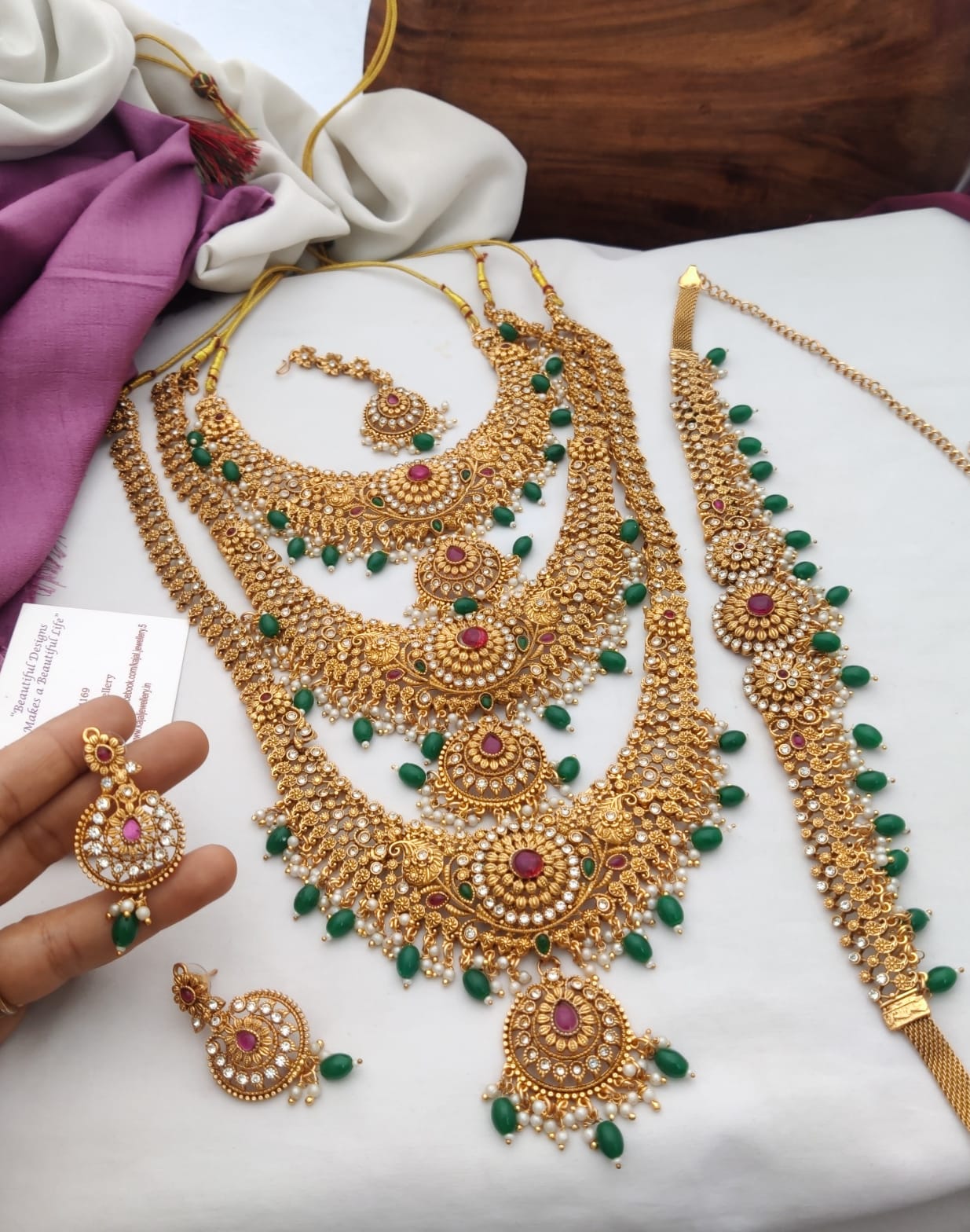 Three layer semi bridal set with green beads